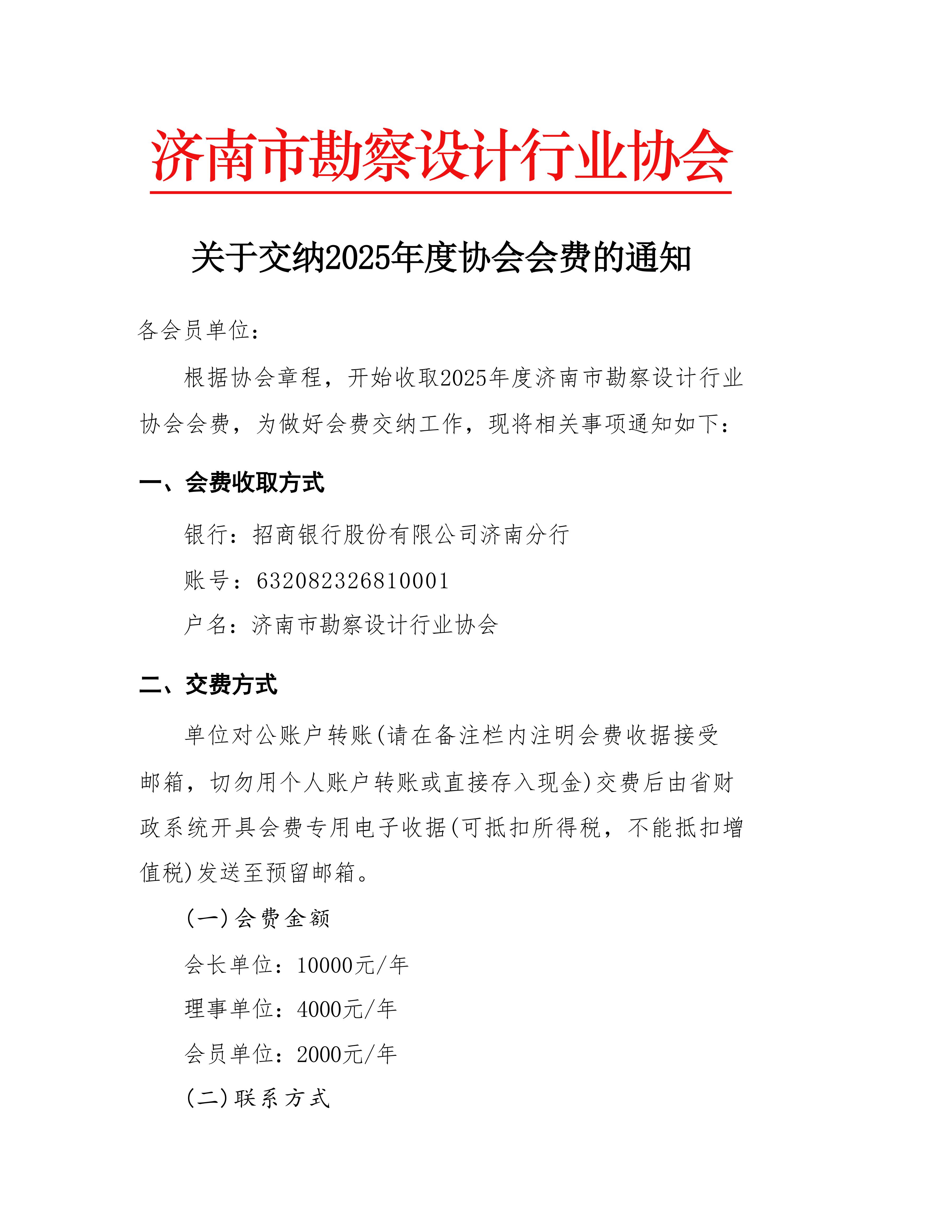 根据协会章程,开始收取2025年度济南市勘察设计行业 协会会费,为做好会费交纳工作,现将相关事项通知如下: