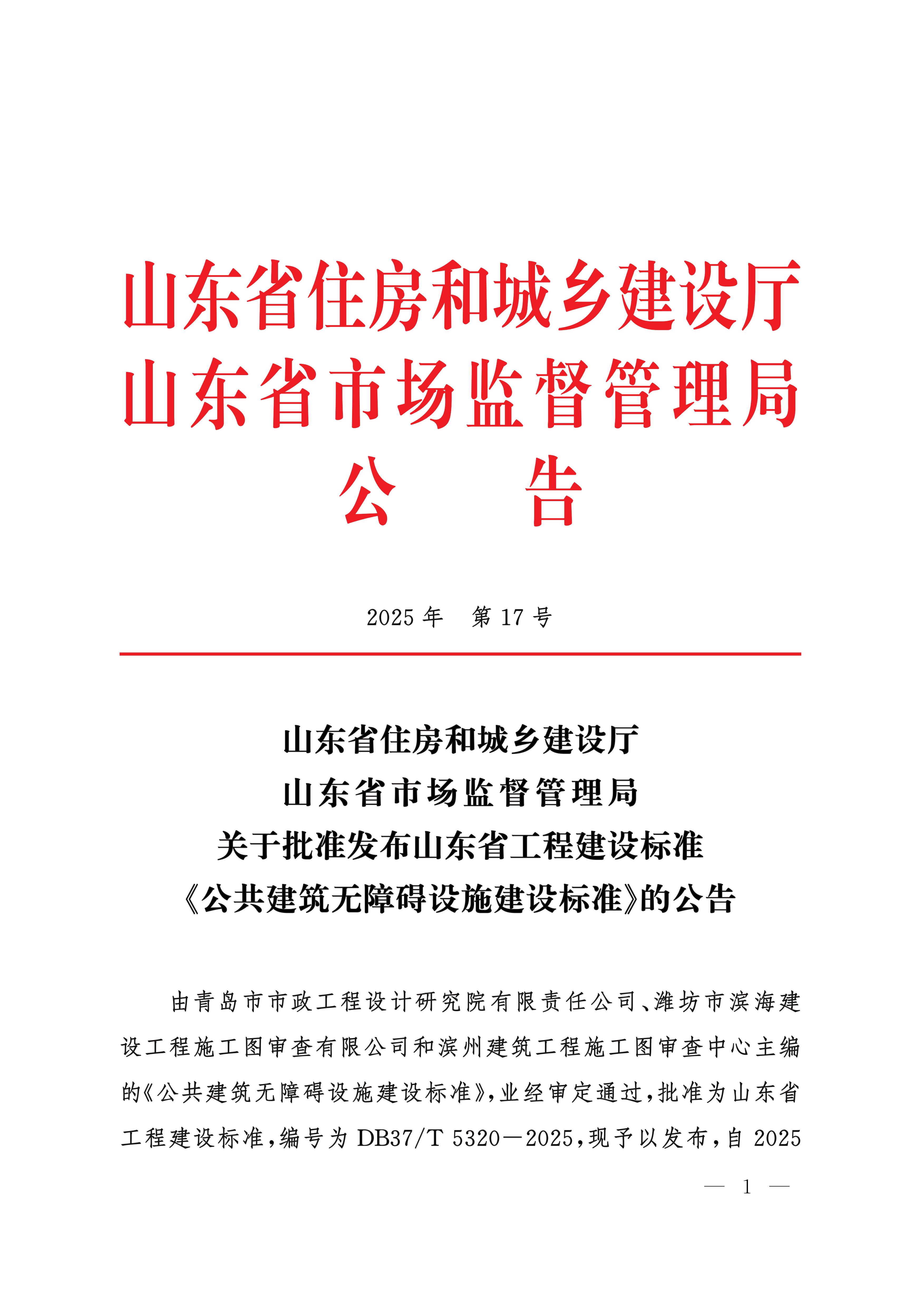 关于批准发布山东省工程建设标准«公共建筑无障碍设施建设标准»的公告
